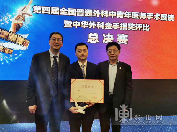 东北网11月28日讯(记者 姜姗姗) 近日,第四届全国普通外科中青年医师手术展演暨“中华外科金手指奖评比”总决赛在上海举行,哈医大一院普外科陈华教授以得分第一名的成绩荣获总决赛一等奖。