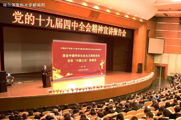 哈尔滨医科大学党委书记、学校党的十九届四中全会精神宣讲团团长张斌以《坚定中国特色社会主义制度自信 书写“中国之治”新篇章”》为题,围绕准确把握和领会党的十九届四中全会的重大意义、深刻领会中国特色社会主义制度和国家治理体系的显著优势、准确把握好《中共中央关于坚持和完善中国特色社会主义制度、推进国家治理体系和治理能力现代化若干重大问题的决定》提出的总体要求、总体目标和重点任务、确保全会确定的各项目标任务落实落靠、持续推动学习宣传贯彻形成热潮五个方面进行了宣讲。