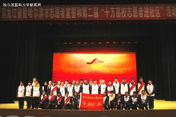 为认真贯彻落实省、市文明办关于《第二届十万高校志愿者进社区活动》的部署和要求,培养具有高校特色的志愿服务团队,在第29个国际“志愿者日”来临之际,药学院“爱·在路上”志愿服务团队一行40人来到东北农业大学音乐厅参加了“黑龙江暨哈尔滨志愿者宣誓和第二届十万高校志愿者进社区活动”启动仪式。参加本次活动的还有来自哈尔滨工业大学、哈尔滨工程大学等十所高校的志愿者,哈尔滨医科大学药学院“爱·在路上”志愿服务团队为哈尔滨医科大学唯一一支被选中的团队参加此次启动仪式。