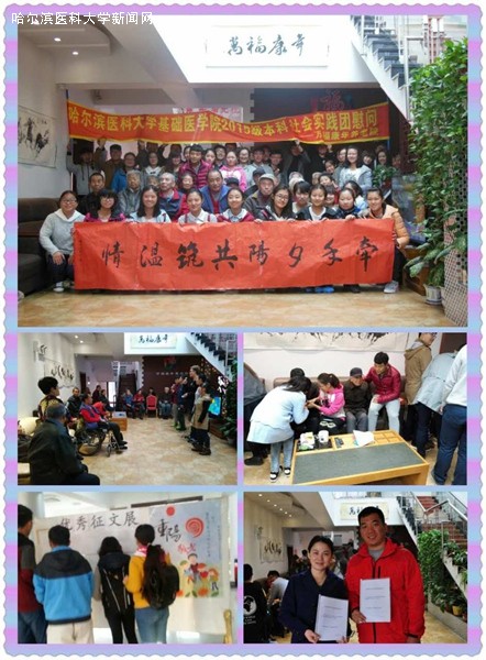 10月17日上午,年级学生会和团总支成员在三位年级老师的带领下,来到哈尔滨市万福康年养老院探望老人,并为老人们献上精心准备的重阳节联欢表演。同学们的红歌演绎、乐器独奏以及温馨小贴士等节目引起了老人们的强烈共鸣,也让他们感受到了来自年轻人的浓浓心意。表演结束后,同学们到老人中间为他们讲解日常保健知识,并关切地询问老人们的身体和生活状况,有些同学甚至在聆听老人讲述往事时落下了感动的热泪。为了能与万福康年养老院建立更长远的合作关系,年级主任柳博老师与养老院院长签署了社会实践基地合作协议书,并与孙锐老师及学生们一同将慰问品送至每位老人手里,让他们感受到来自哈医大基础医学院2015级本科专业全体师生的融融暖意。临走时,老人们依依不舍的叮嘱同学们要好好学习医学知识,珍惜时光,不辜负祖国的培养。同学们均表示一定不负众望,努力学习,争取早日成为医学栋梁,为老人们的身体健康贡献出自己的一份力量。
