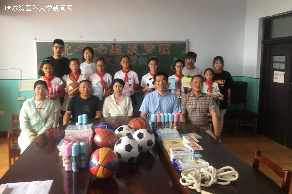 6月26日,阳光明媚,基础七年制北斗七星筑梦团一行人在哈尔滨医科大学基础医学院副处级辅导员王玉清的带领下,顶着33℃的高温,来到了哈尔滨市团结镇恒星小学开展支教和捐助活动。