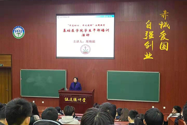 11月15日晚,在伍连德讲堂举办了“不忘初心、牢记使命”基础医学院学生干部培训活动,本次活动邀请了校学工部部长、学生处处长周艳娟教授为基础医学院大一新生进行讲座,基础医学院副处级辅导员王玉清老师、2019级年级老师以及所有大一学生会、团总支成员、班级干部、寝室长近500人聆听了此次讲座。