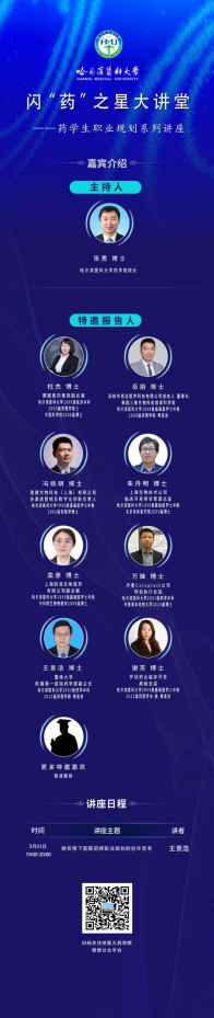 闪“药”星光,指引未来。为帮助学生深入了解药学领域考研就业方向和职业发展前景,切实抓住当前严峻疫情背景下毕业生求职的关键黄金期,引导学生树立远大理想,明晰人生目标,全方位打开高质量就业新局面,药学院近期组织开展闪“药”之星大讲堂暨药学生职业规划系列讲座,将邀请学校培养出的优秀校友,特别是药学院的优秀毕业生回到母校,倾情讲述他们的成长经历、求职经验以及职业规划平台。这些毕业生中不乏医院副主任、公司高管等高层次人才,力求给学生在了解专业特色和未来职业发展方向提供更多参考。