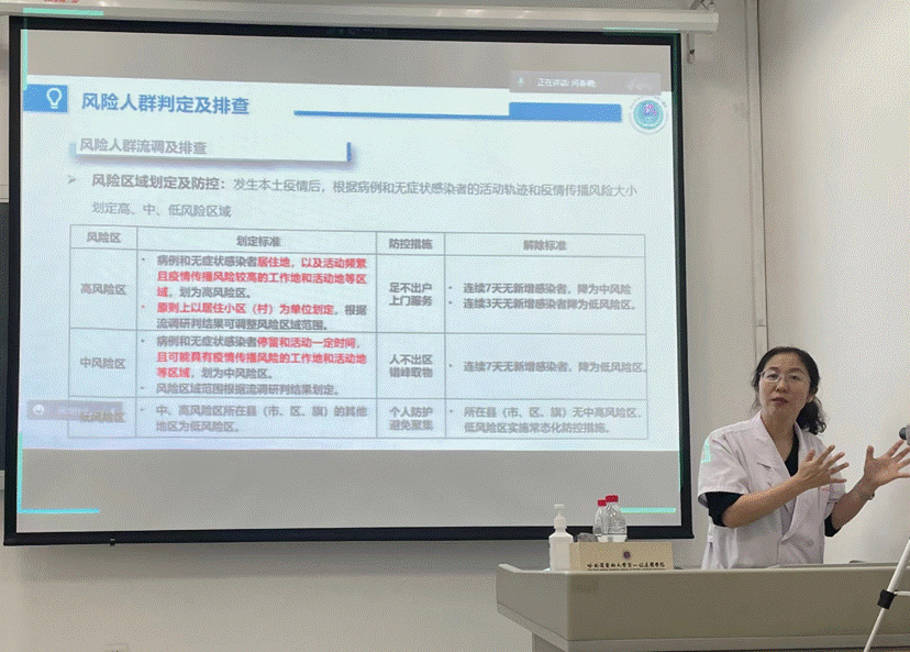 感染监控科主任任慧为全院师生解读《新型冠状病毒肺炎防控方案(第九版)》。任慧主任重点介绍了优化调整风险人员隔离管理期限和方式、统一封管控区和中高风险区划定标准、完善疫情监测要求和优化区域核酸检测策略等方面内容,并就学生返校如何按照第九版新冠疫情防控方案的新要求做好相关工作,提出富有针对性的意见和建议。
