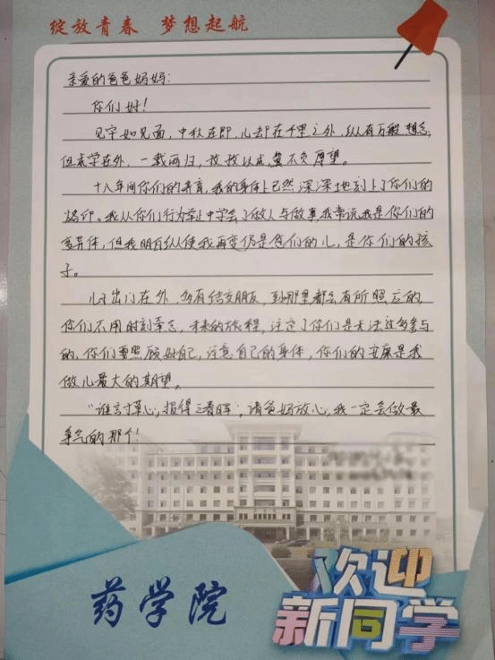 近日,为缓解远在他乡的父母心中焦虑牵挂,药学院面向2022级新生组织开展《送一封家书,表一纸真情》活动,山海有距,亲情无间,虽所爱相隔山海,但关爱永在心头。