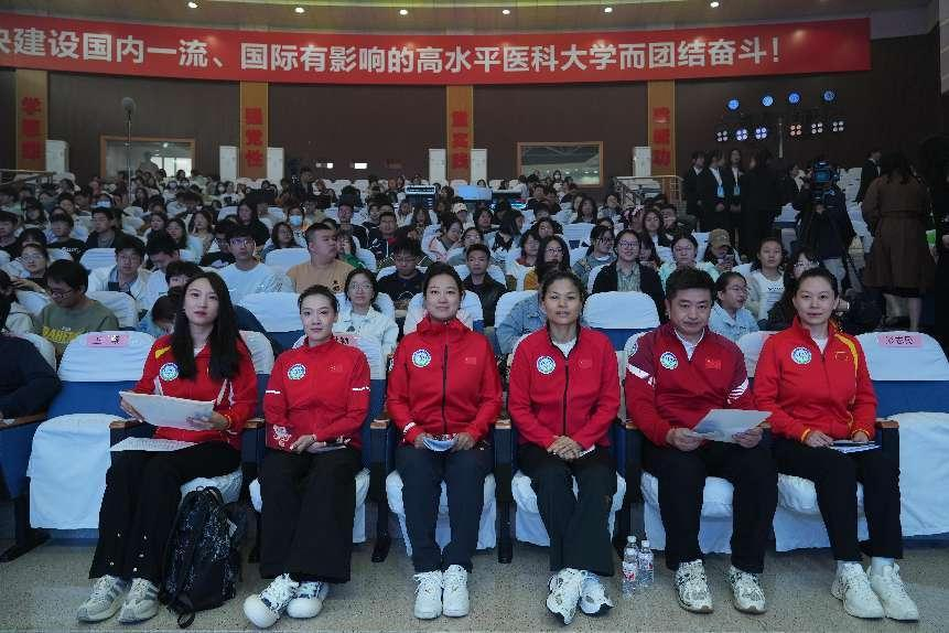 宣讲会在歌曲《篇章》中拉开帷幕。冠军运动员李爽、于鑫娜、朱秋颖、马海艳、杜超、李文文分别分享了他们努力拼搏,为国争光,夺得冠军的心路历程,赢得了现场同学们的阵阵掌声。同学们纷纷表示,将以冠军们为榜样,敢于有梦、勇于追梦、勤于圆梦,为强国建设、民族复兴挺膺担当。