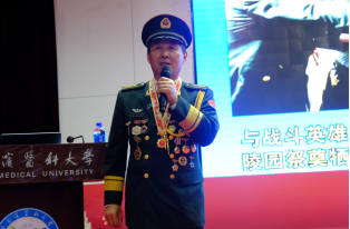 胡国桥大校将英雄的意义与哈医学子的培养相结合,他说:“英雄可以是顶起炸药包的身影,英雄也是放在哪里都发光的一颗螺丝钉。背上有傲骨、胸中有担当,我们都可以成为响当当的英雄!”在胡大校慷慨激昂的话语和掷地有声的鼓励下,同学们深受感动、热血沸腾,现场一次次响起经久不断的掌声。