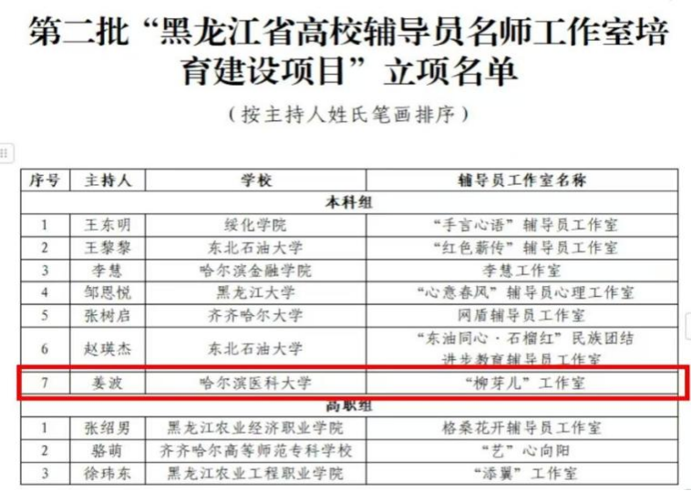 近日,黑龙江省教育厅组织开展第十六届“黑龙江省高校辅导员年度人物”推选展示活动,并公布第二批“黑龙江省高校辅导员名师工作室”,我校第一临床医学院姜波获“黑龙江省高校辅导员年度人物提名”荣誉,主持的“柳芽儿”辅导员工作室成功入选省辅导员名师工作室培育建设项目。