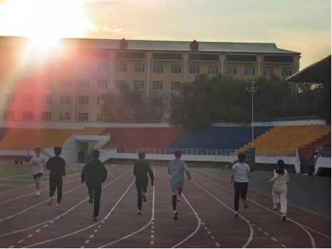 同学们迎着朝阳在体育场跑步